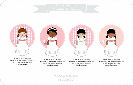 El año pasado hice algunas cosas para la Primera Comunión de una niña china, Lucía Lin. También tengo una amiga que tiene una hija que vino de Etiopía, que me sugirió que podía hacer Recordatorios de Primera Comunión para niñas como Noa, porque no es fácil encontrar cosas personalizadas para ellas ...ni para ellos.