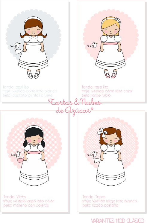 Y si no queréis personalizarlo "del todo" podéis escoger entre los distintos fondos o modelos, vestido largo o corto, con o sin lazo, pelo liso o rizado, peinados y color de pelo... Como mas se parezca a la niña
